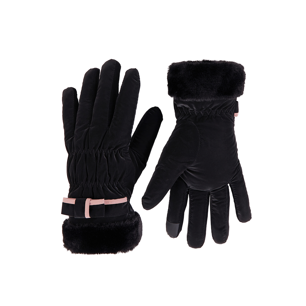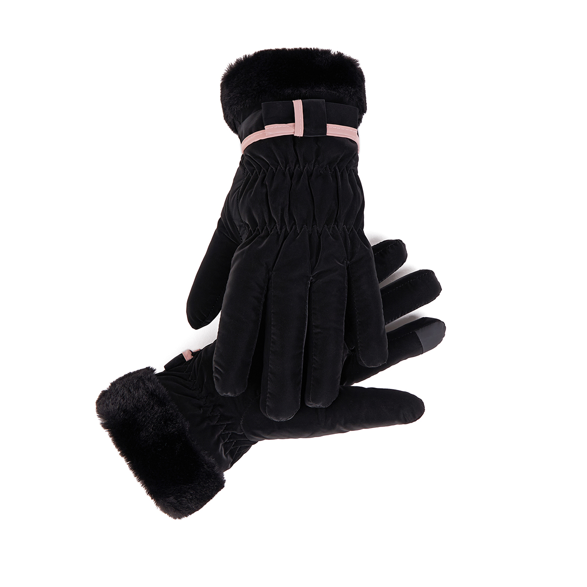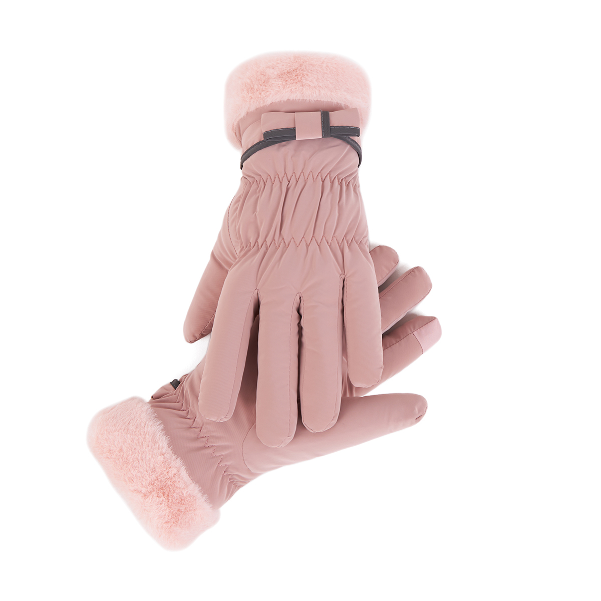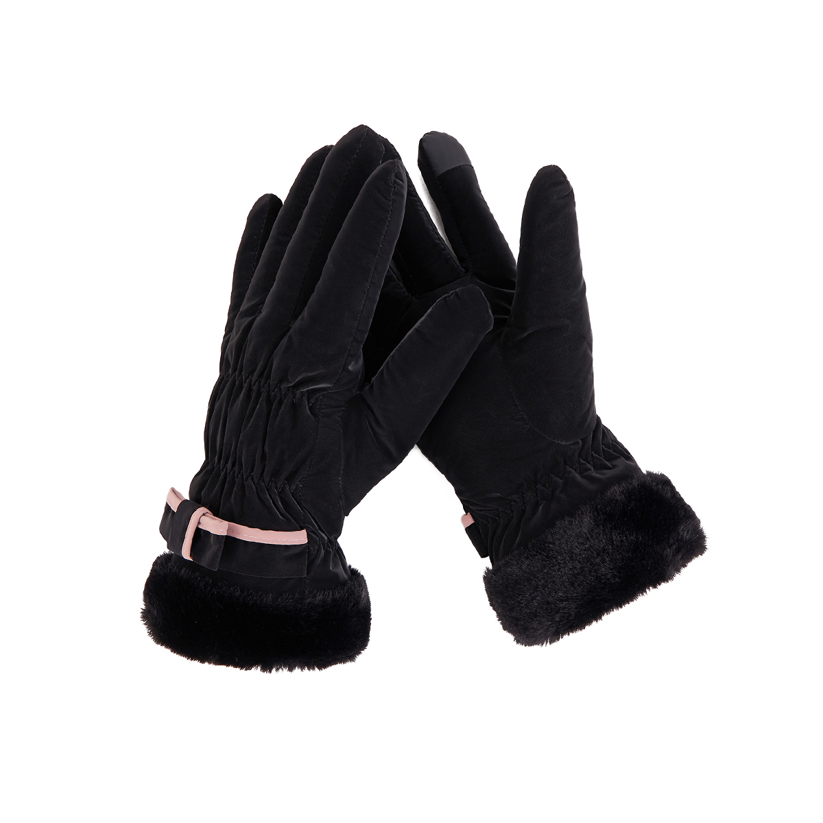 ถุงมือกันหนาว วัสดุเป็นผ้า ด้านในบุขนนุ่มๆและกันหนาวได้ดี ดีไซน์น่ารักมาก ช่วงข้อมือแต่งขนนุ่มๆและโบว์เล็กๆ น่ารักมากค่ะ สามารถทัชสกรีนเล่นโทรศัพท์ได้ที่นิ้วชี้ (การทัชสกรีนจะไม่ 100% เท่ากับถุงมือหนัง) มีให้เลือก 5 สี ชมพู , เขียวมิ้น , เทา , ดำ , ครีม