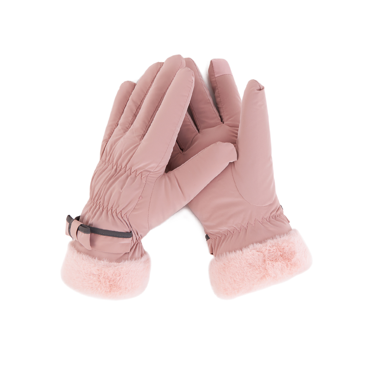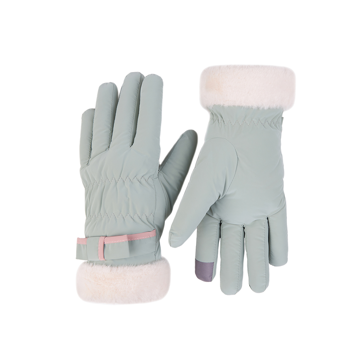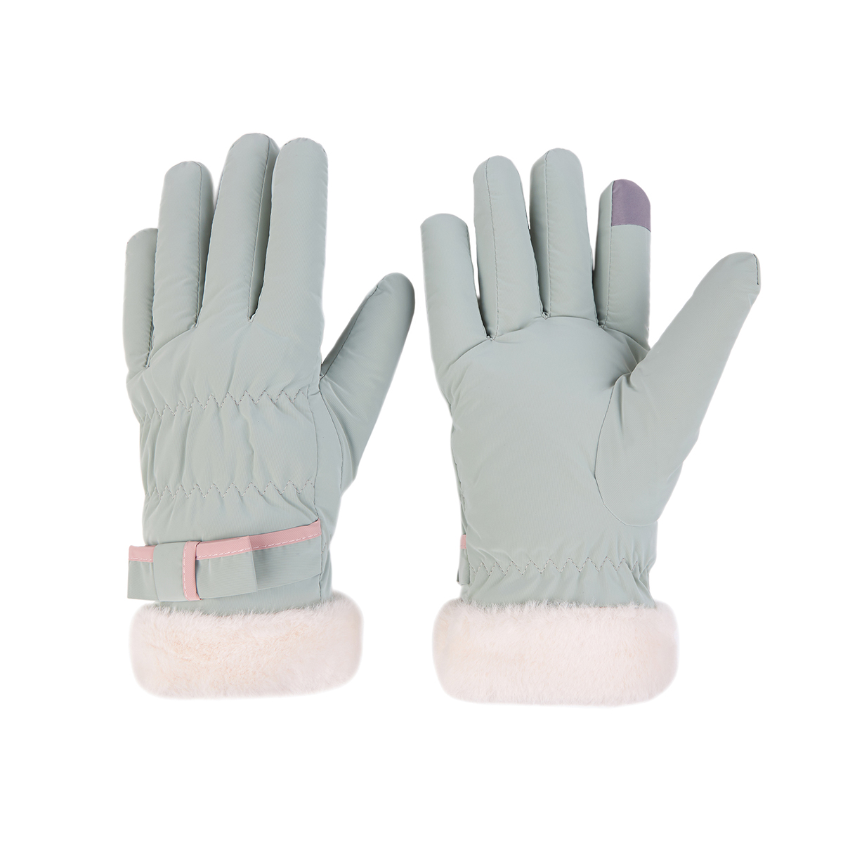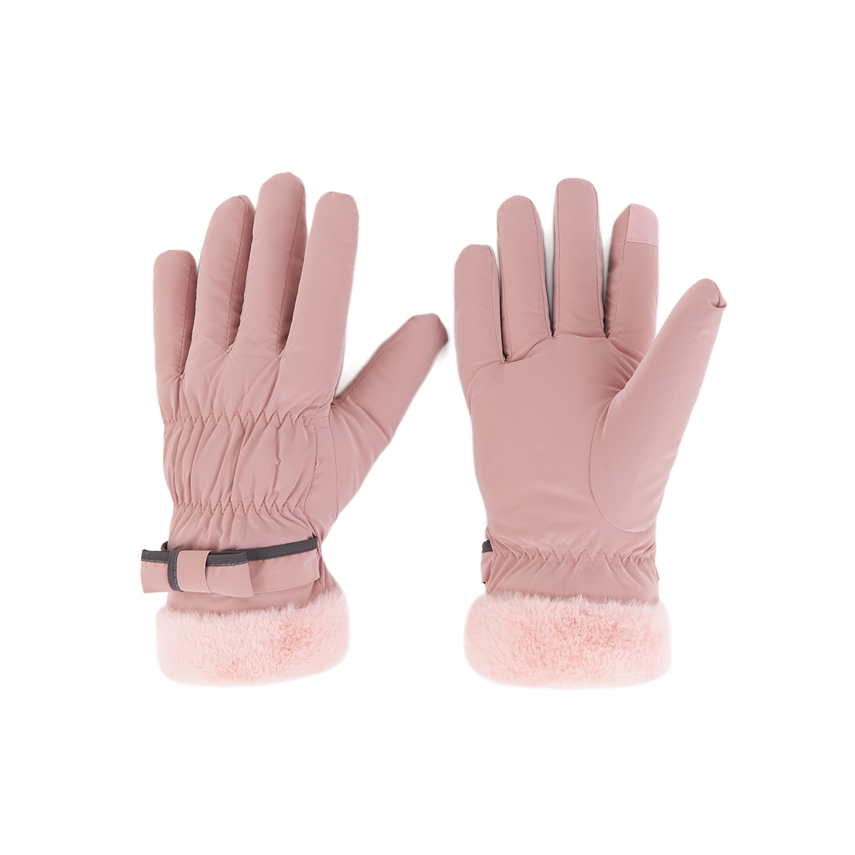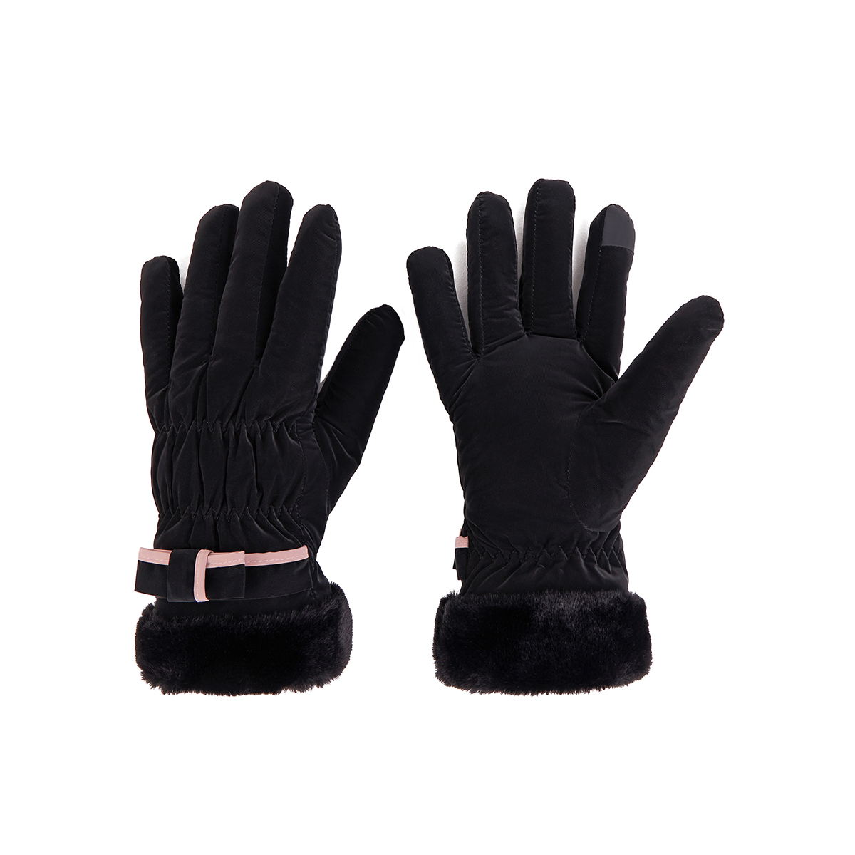 ถุงมือกันหนาว วัสดุเป็นผ้า ด้านในบุขนนุ่มๆและกันหนาวได้ดี ดีไซน์น่ารักมาก ช่วงข้อมือแต่งขนนุ่มๆและโบว์เล็กๆ น่ารักมากค่ะ สามารถทัชสกรีนเล่นโทรศัพท์ได้ที่นิ้วชี้ (การทัชสกรีนจะไม่ 100% เท่ากับถุงมือหนัง) มีให้เลือก 5 สี ชมพู , เขียวมิ้น , เทา , ดำ , ครีม