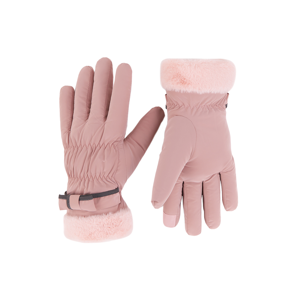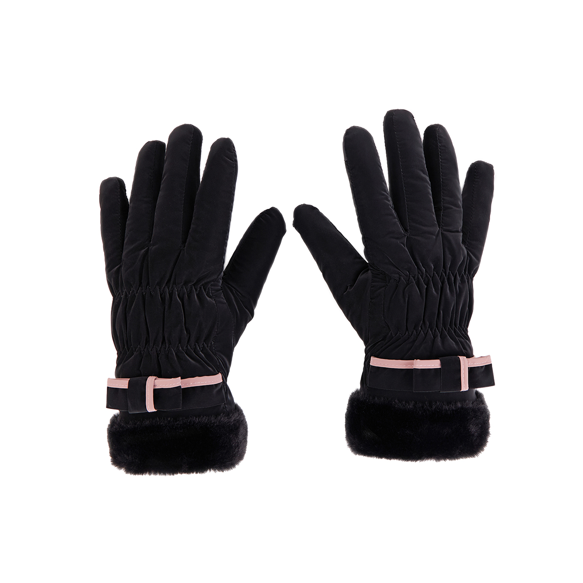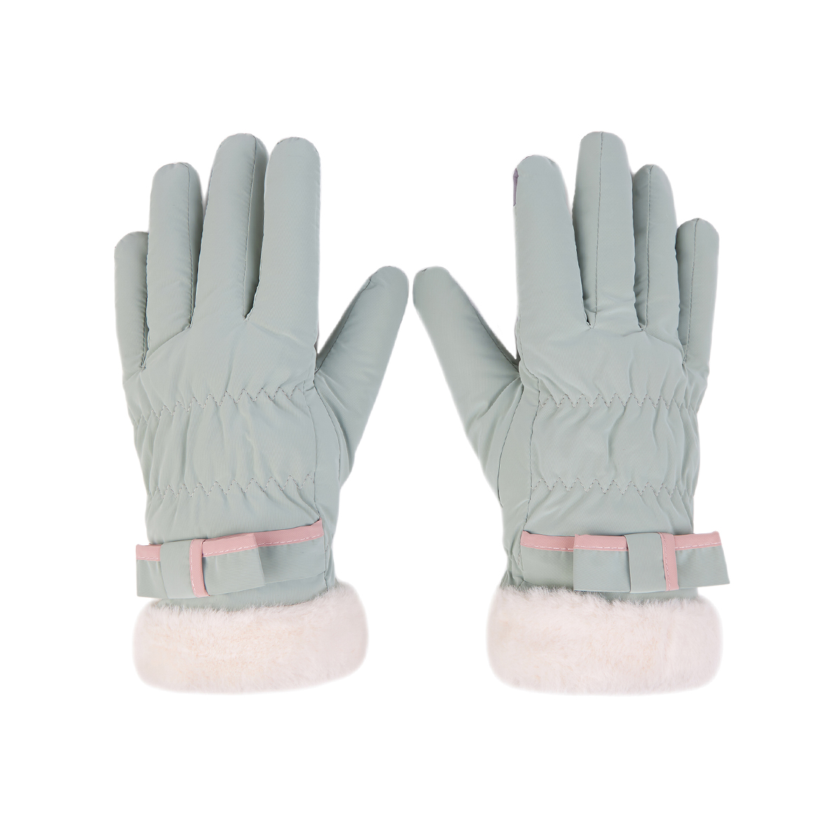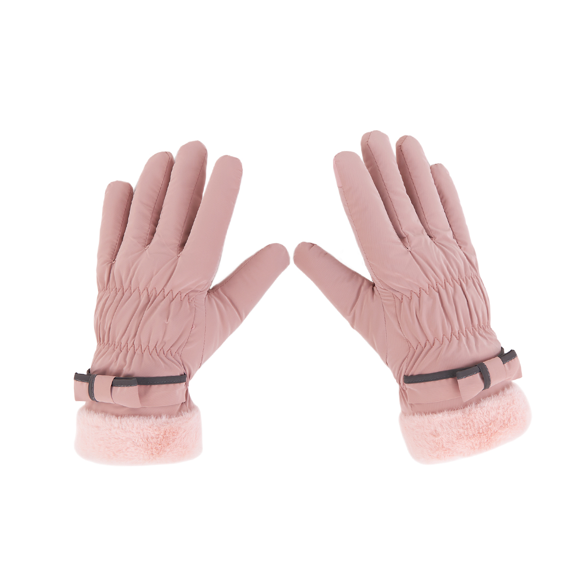 ถุงมือกันหนาว วัสดุเป็นผ้า ด้านในบุขนนุ่มๆและกันหนาวได้ดี ดีไซน์น่ารักมาก ช่วงข้อมือแต่งขนนุ่มๆและโบว์เล็กๆ น่ารักมากค่ะ สามารถทัชสกรีนเล่นโทรศัพท์ได้ที่นิ้วชี้ (การทัชสกรีนจะไม่ 100% เท่ากับถุงมือหนัง) มีให้เลือก 5 สี ชมพู , เขียวมิ้น , เทา , ดำ , ครีม