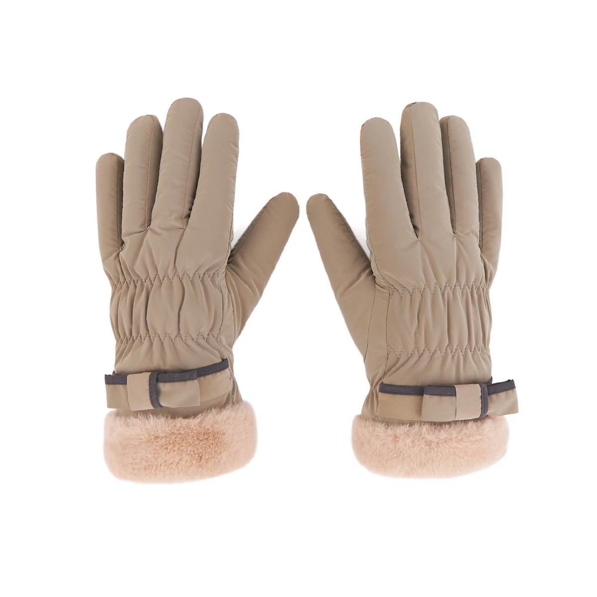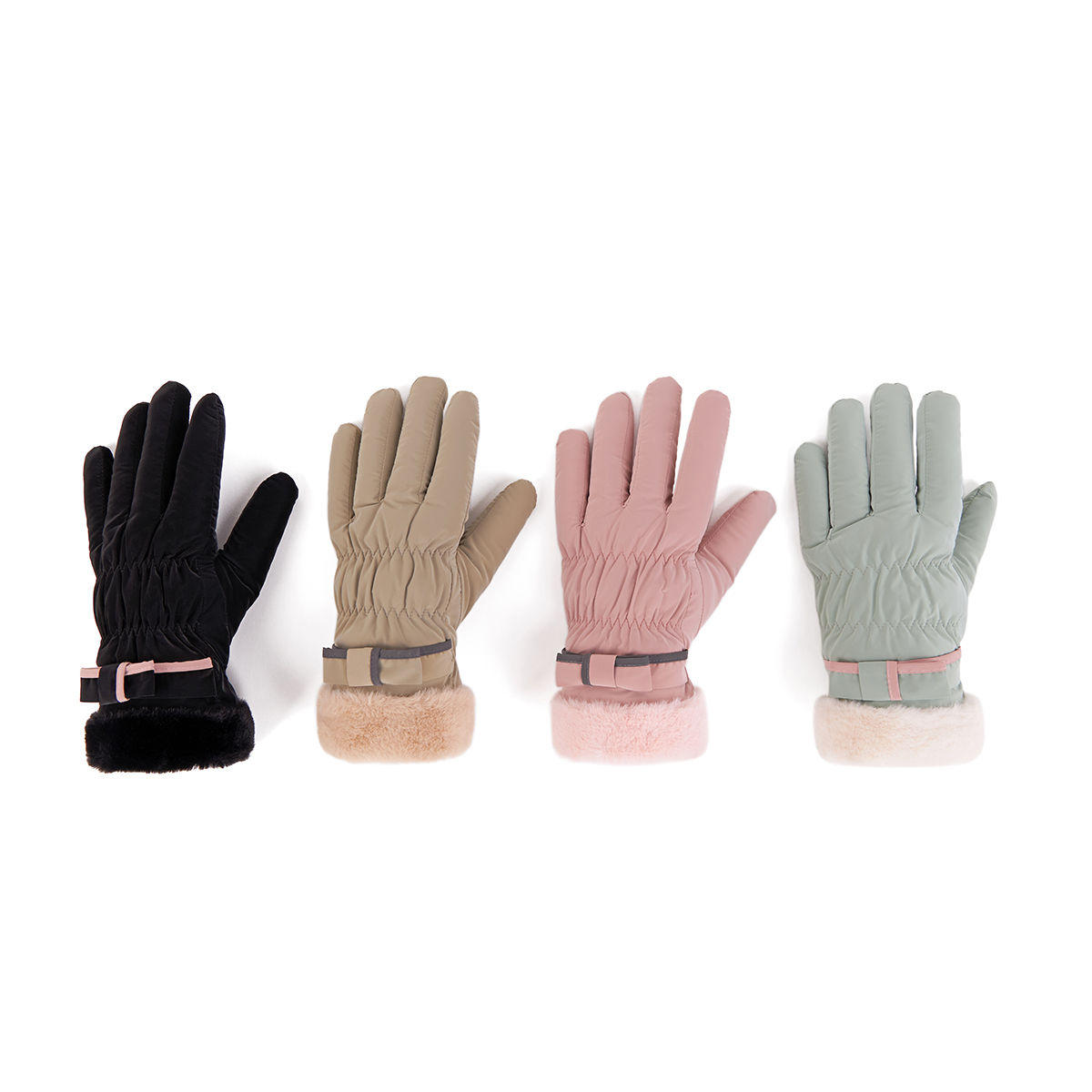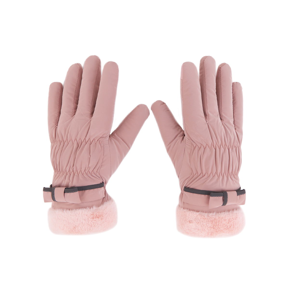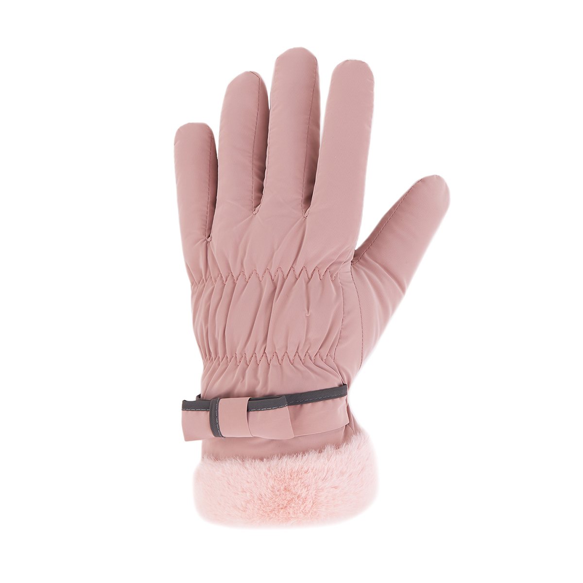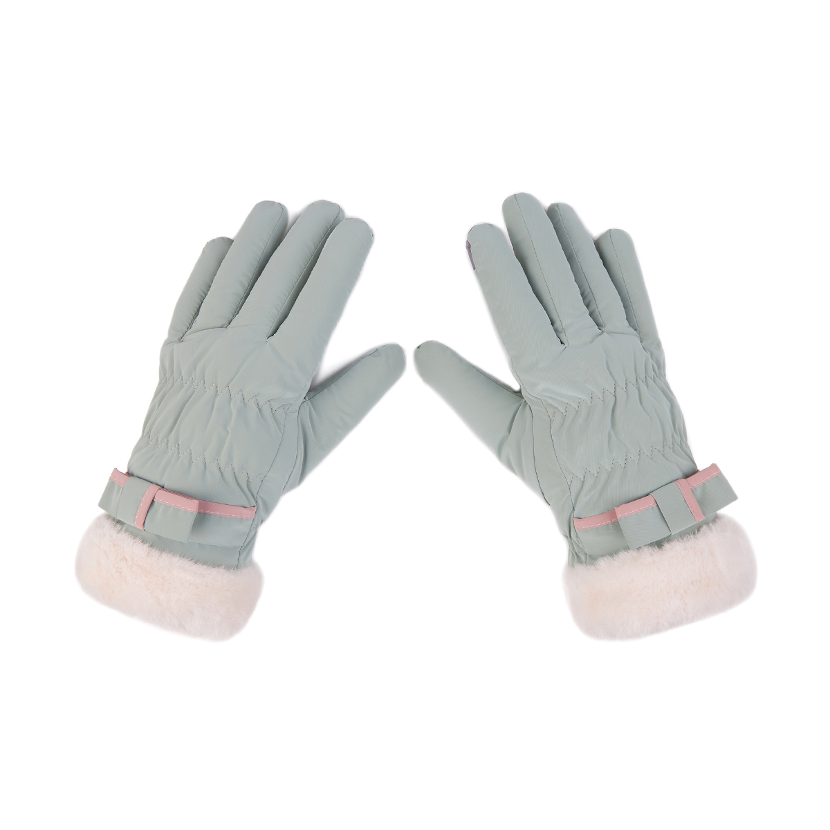 ถุงมือกันหนาว วัสดุเป็นผ้า ด้านในบุขนนุ่มๆและกันหนาวได้ดี ดีไซน์น่ารักมาก ช่วงข้อมือแต่งขนนุ่มๆและโบว์เล็กๆ น่ารักมากค่ะ สามารถทัชสกรีนเล่นโทรศัพท์ได้ที่นิ้วชี้ (การทัชสกรีนจะไม่ 100% เท่ากับถุงมือหนัง) มีให้เลือก 5 สี ชมพู , เขียวมิ้น , เทา , ดำ , ครีม