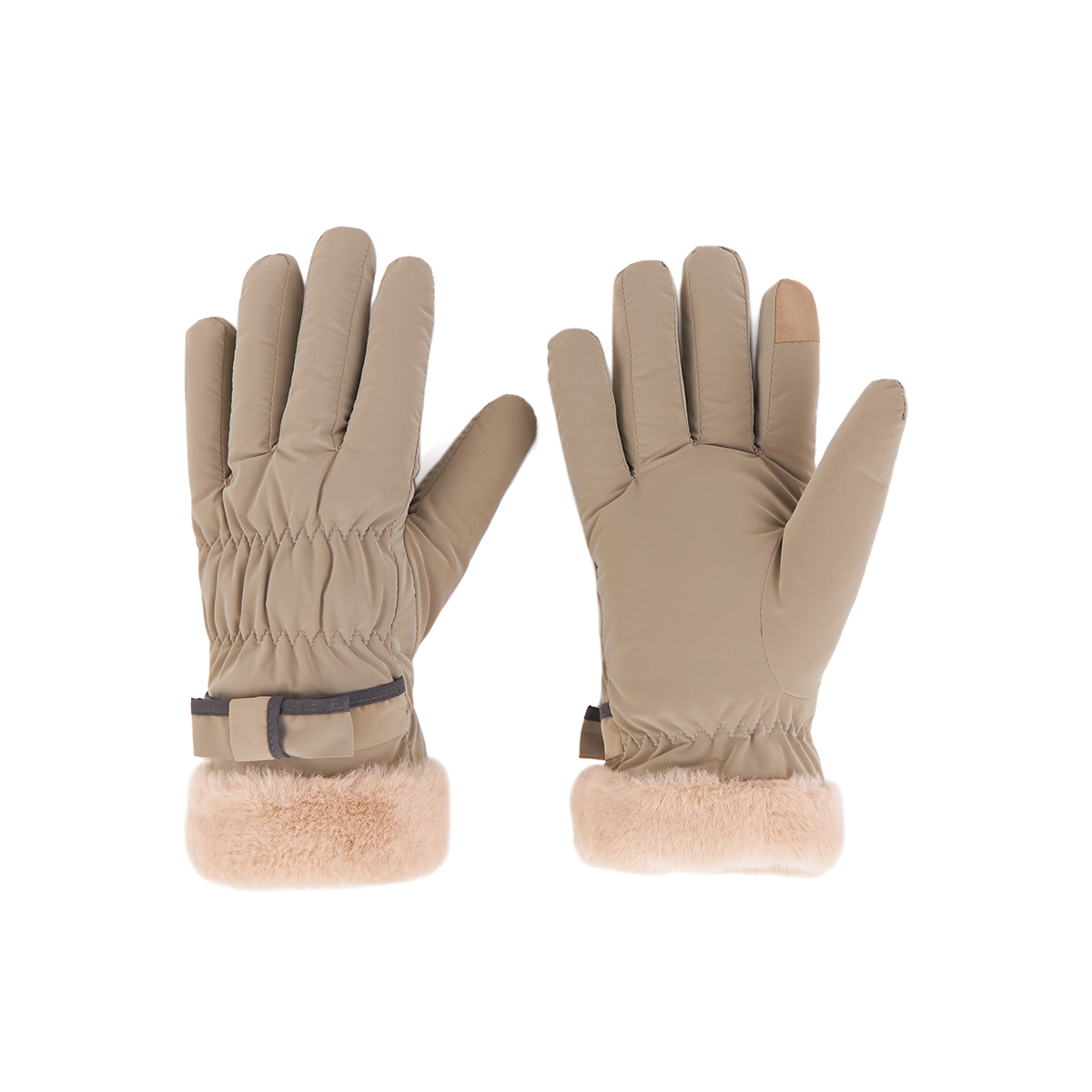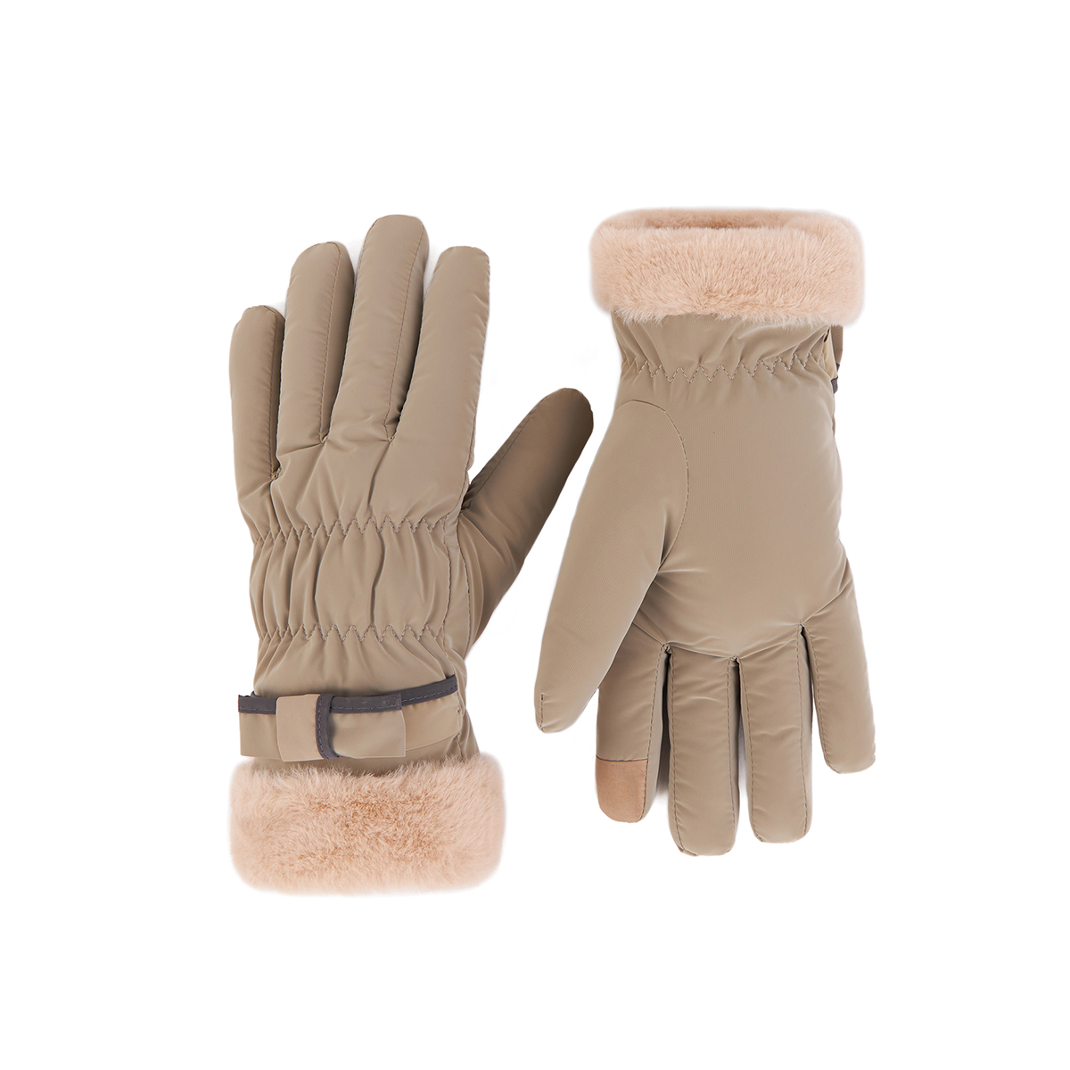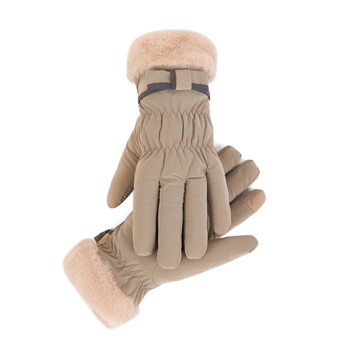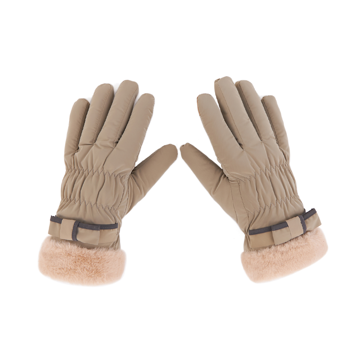 ถุงมือกันหนาว วัสดุเป็นผ้า ด้านในบุขนนุ่มๆและกันหนาวได้ดี ดีไซน์น่ารักมาก ช่วงข้อมือแต่งขนนุ่มๆและโบว์เล็กๆ น่ารักมากค่ะ สามารถทัชสกรีนเล่นโทรศัพท์ได้ที่นิ้วชี้ (การทัชสกรีนจะไม่ 100% เท่ากับถุงมือหนัง) มีให้เลือก 5 สี ชมพู , เขียวมิ้น , เทา , ดำ , ครีม